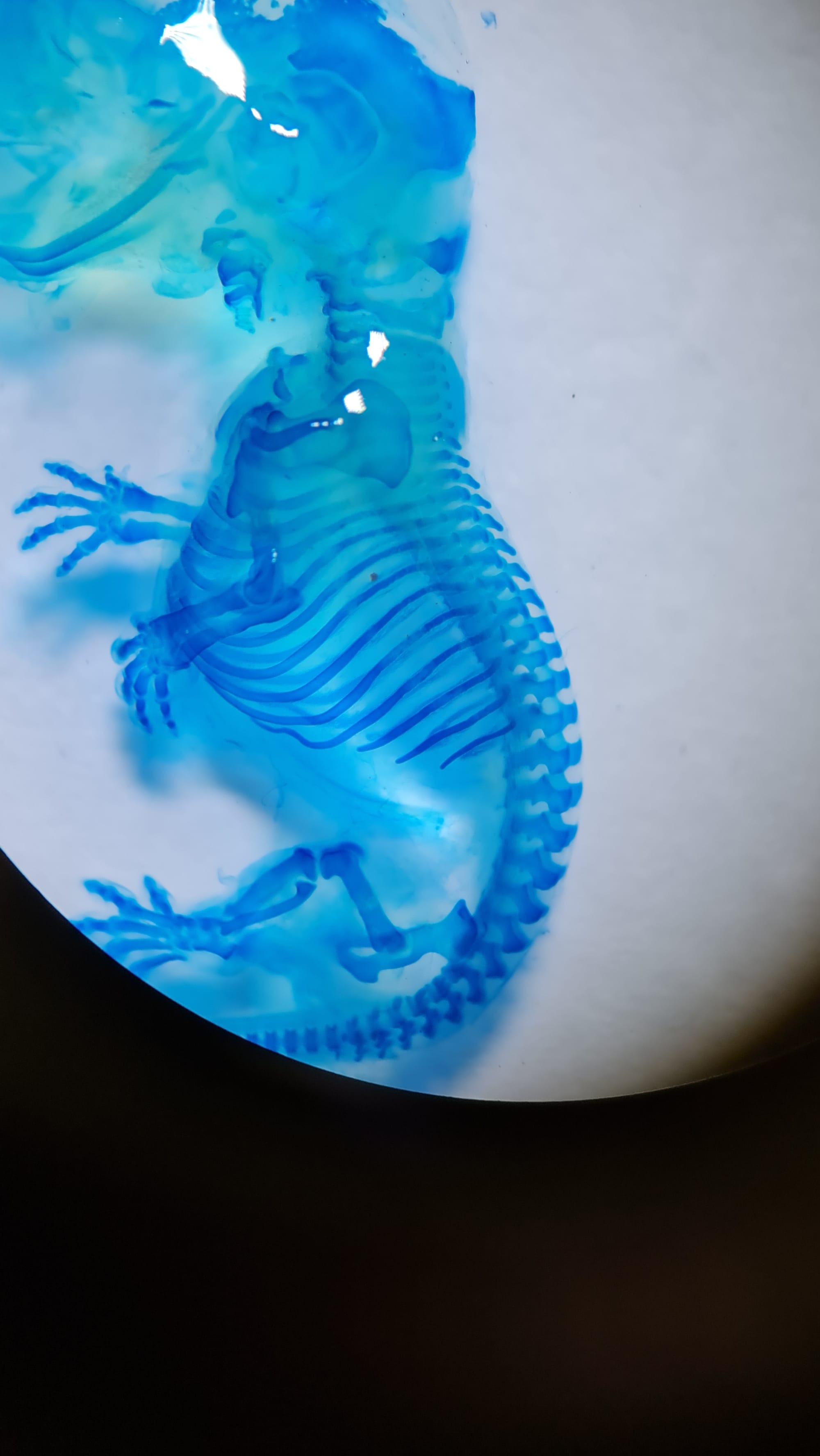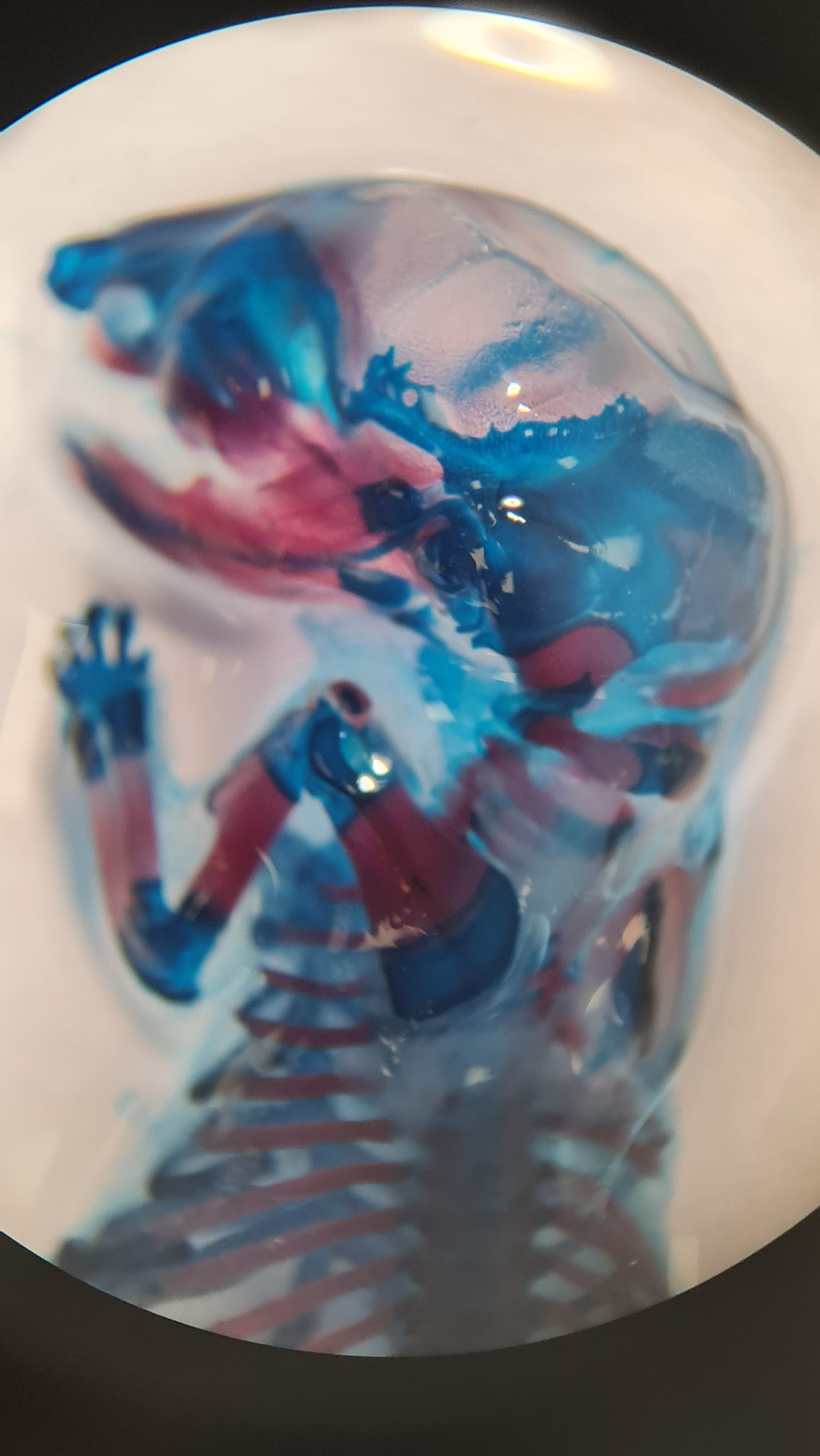 To understand the technical process of staining and preserving of samples, we stain and observe different developmental stages of a rat sample. Observing the changes of certain structures from cartilage to bone as development takes place.