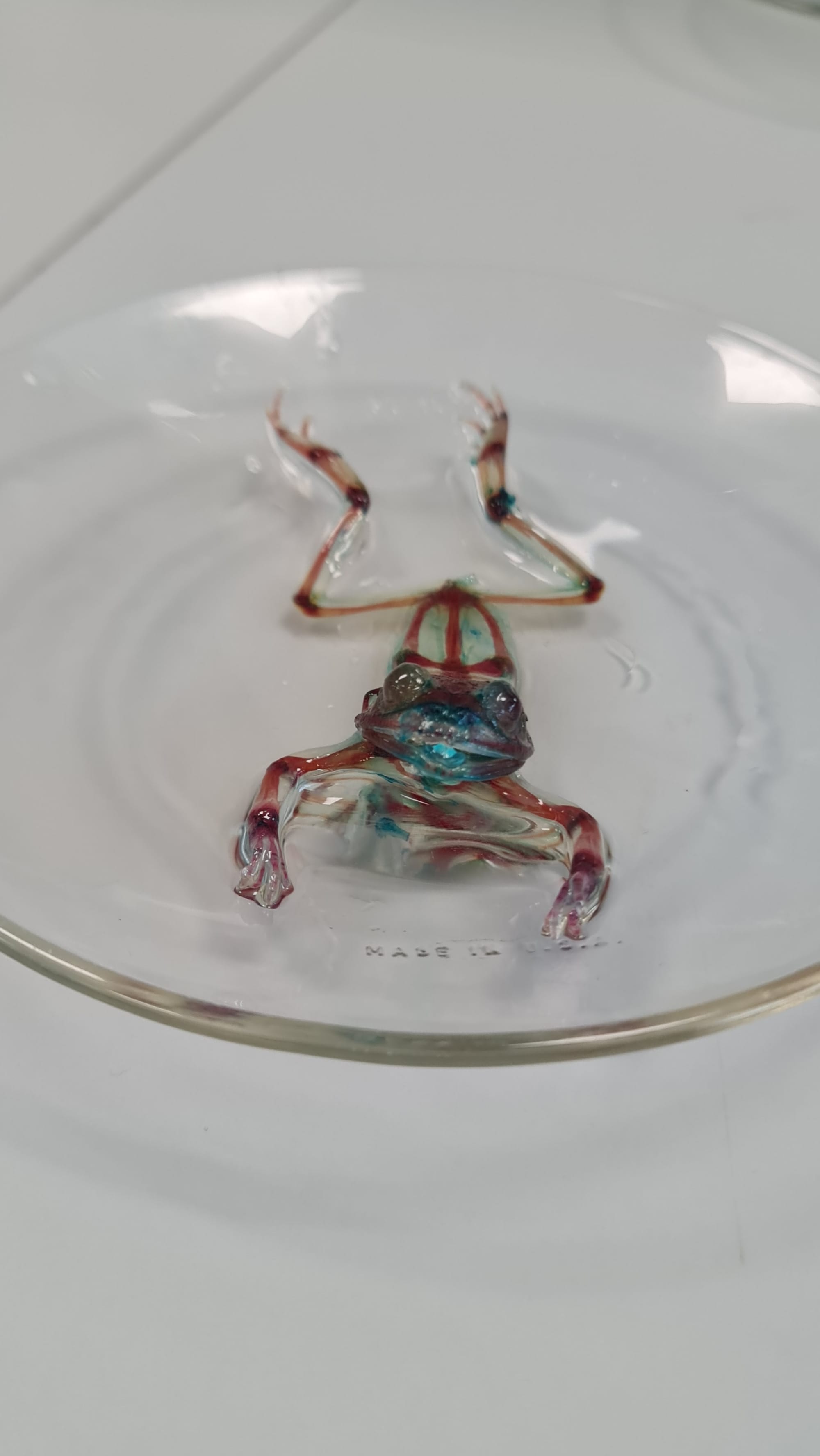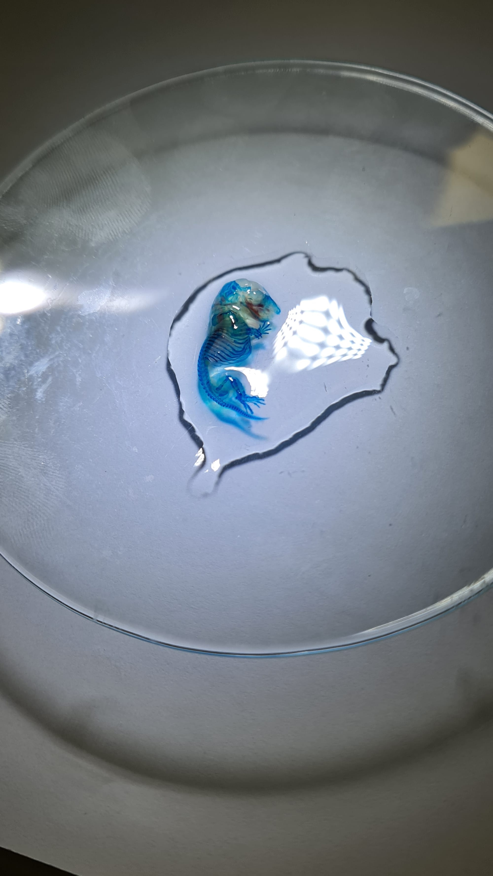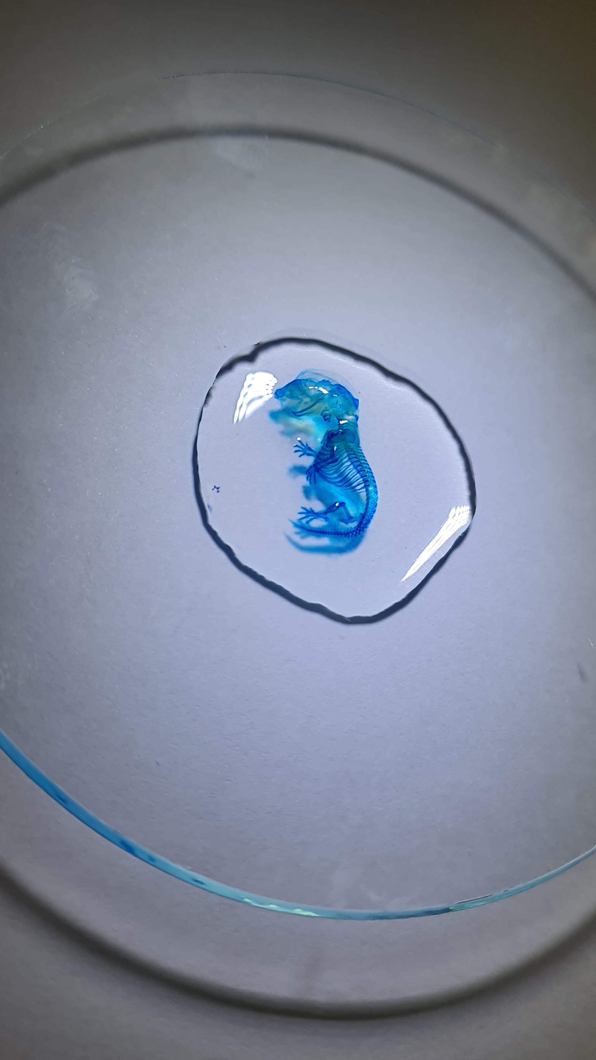 Staining of bone and cartilage using the Alcian blue and Alizarin red for different developmental stages. (The lower left is a stained frog while the others are of a rat)