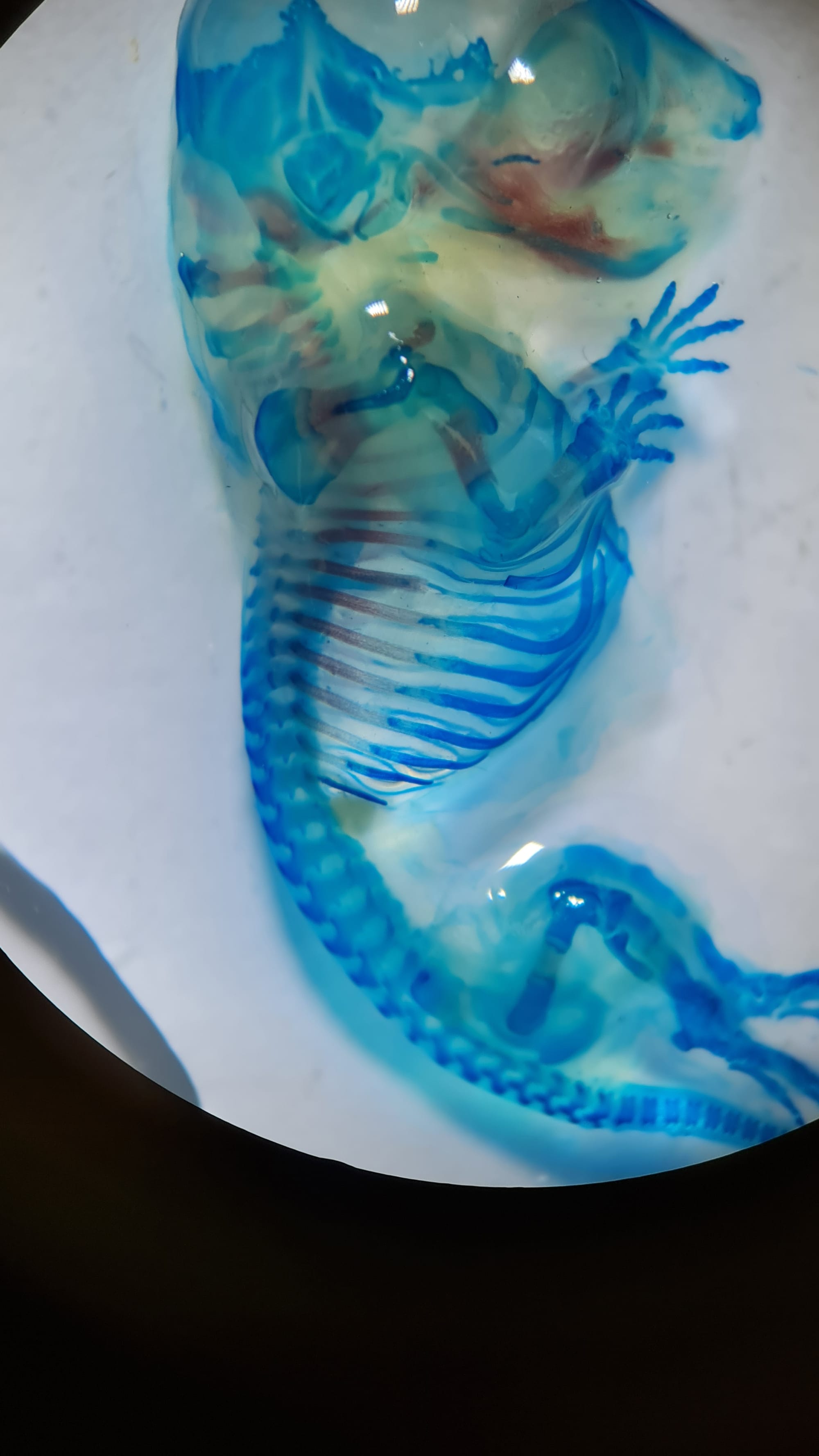 Interestingly, in early stages of rat development most of the structures are stained blue meaning that it is cartilage but as the rat grow and develop, the cartilage structures transform into bony structures which is then stained red.